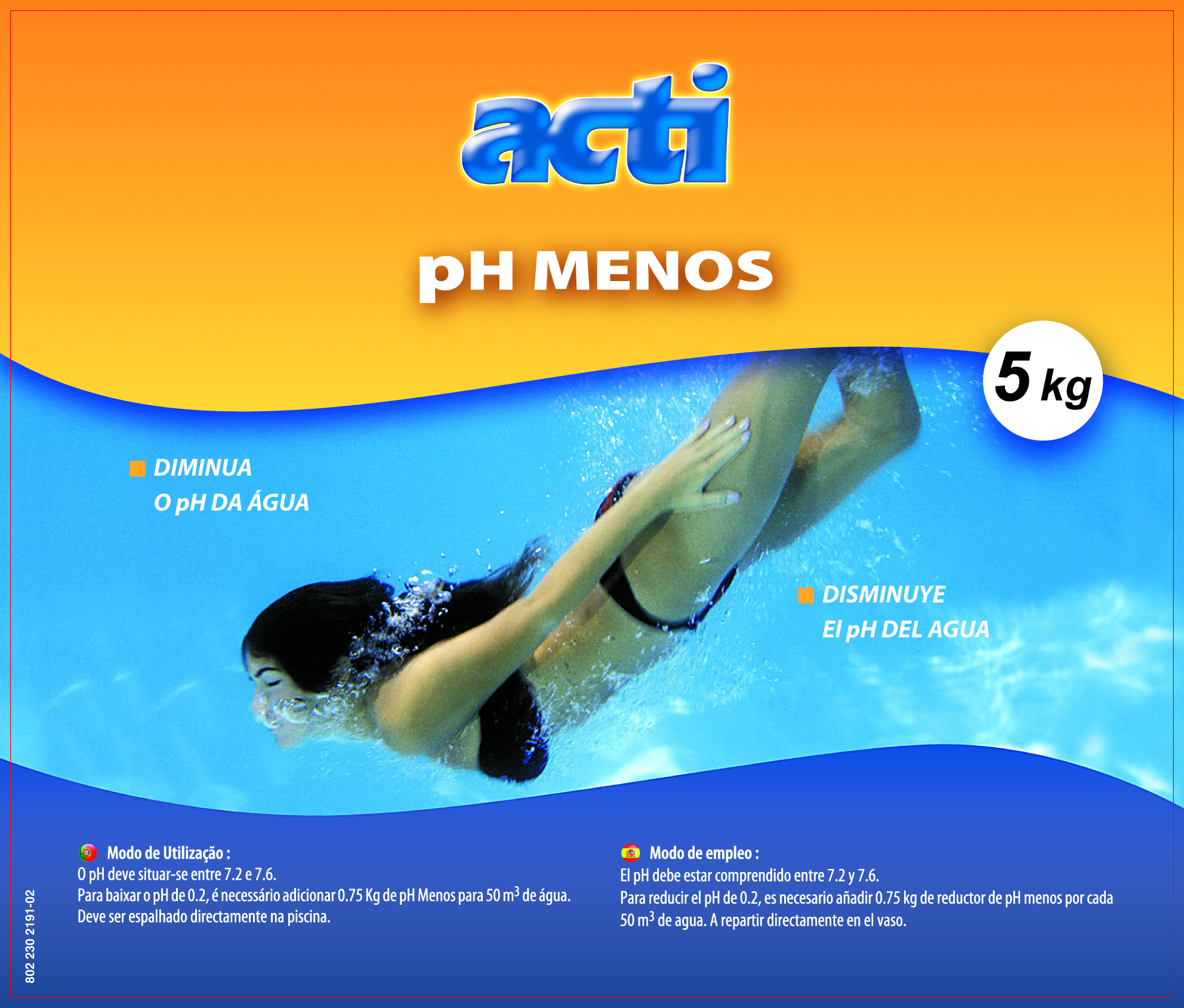 O Ph deve situar-se entre 7,2 e 7,6. Para baixar o pH 0,2 é necessário adicionar 0,5kg de pH menos para 10m3 de água. Deve ser espalhado directamente na piscina. Fazer esta operação faseada com intervalo de 2 horas entre cada uma.